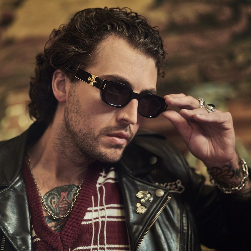 Designed in collaboration with rock'n'roll jeweller The Great Frog, these sunglasses are punctuated with irreverent iconography; a Dagger and Soaring Eagle embellish the front and temple, hand cast from Sterling Silver. They're shaped into a soft, square silhouette that nods to old-school biker frames.